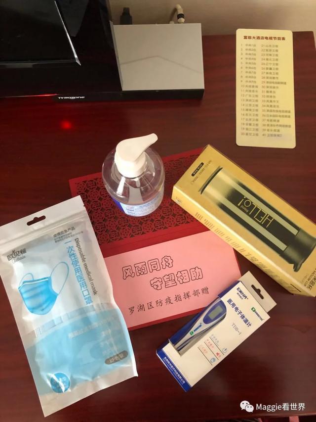 剛剛門鈴又響,原來是保安哥哥送來了羅湖區蓮塘街道的"健康包",有溫度計、保溫杯、一包口罩以及一瓶酒精免洗洗手液。還有羅湖區疫情防控指揮部的慰問信:上面的兩個詞語"風雨同舟、守望相助",讓我心裏覺得暖暖噠。