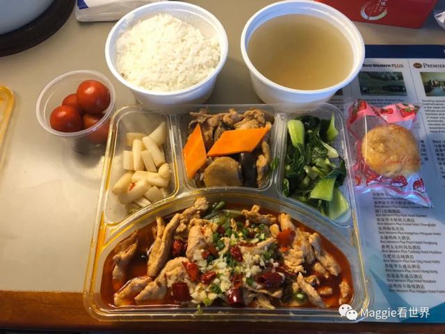 一日三餐有工作人員送到門口,四菜一湯、兩葷兩素,葷菜份量比素菜大,外加水果和甜點。如果沒有說明,菜品會有辣的,後來我們打電話給餐飲部後,今天的菜就全部是不辣的啦。