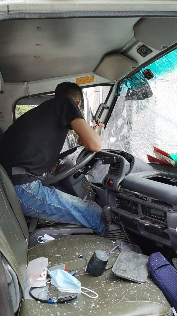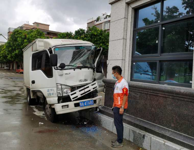 当天下午,番禺区大龙街网格员正在开展日常巡查,突然听到“砰”的一声,原来是附近路上有辆货车撞到了路边的岗亭。肇事货车驾驶室严重变形,司机双腿被卡在驾驶室内无法动弹。