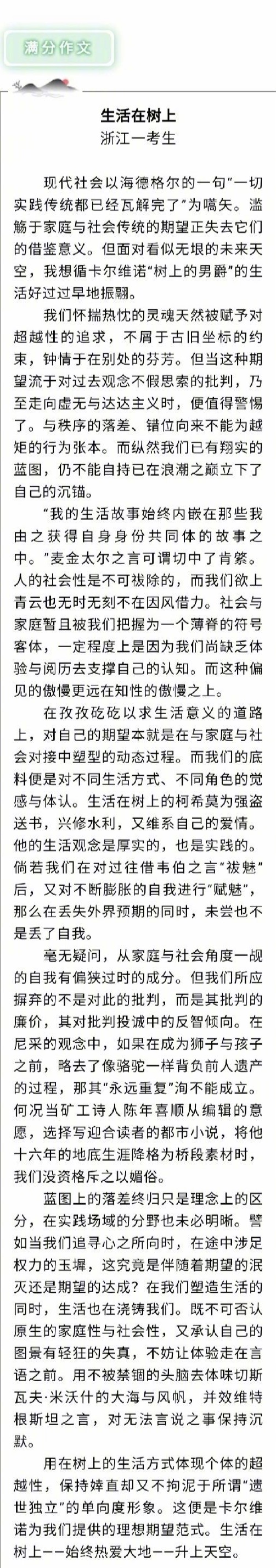 以上语句来自于一篇名为《生活在树上》的浙江省2020年高考满分作文。浙江省高考作文阅卷大组教授点评文章称“老到和晦涩同在,思维的深刻与稳当俱备。”