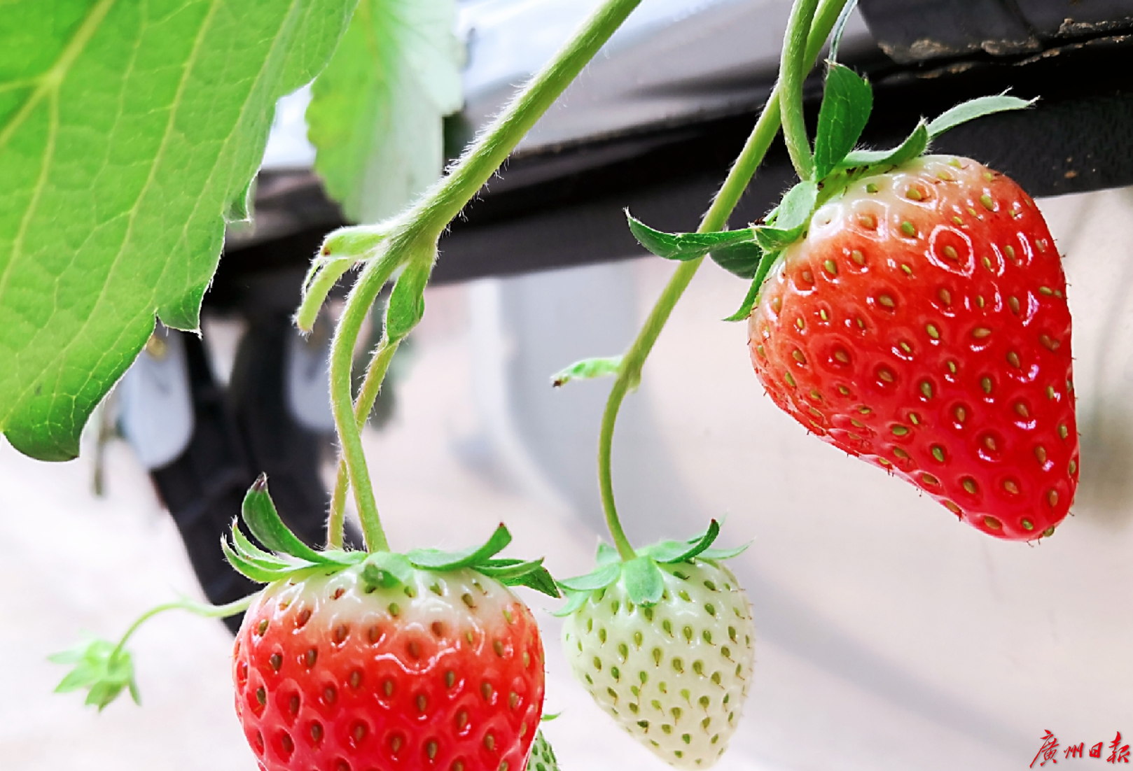 在绿沃川公司,空中草莓园的开业给赤坭镇带来了人气。草莓种植运用“悬挂移动式栽培床技术”,一排排娇艳欲滴的草莓挂在空中,根据采摘高度还可以实现自动升降,游客只需要抬抬手就可以将草莓摘下放入果篮中。据悉,园区最高每日接待500名游客。