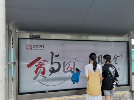 市民在公交站台观看廉政公益广告。