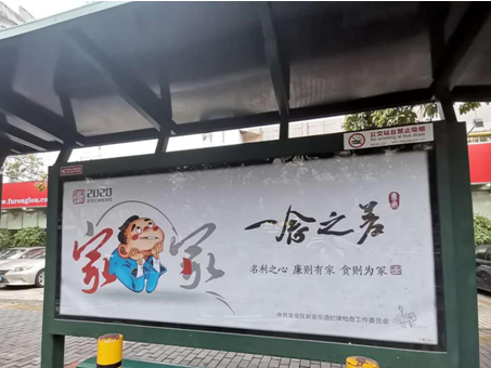 8月以来,新安以“纪律教育学习月”和“党纪法规教育学习”活动为契机,寓廉于“行”,运用公交站台人流量大、覆盖面广、更接地气的优势,打造了以“廉洁”为主题的200余个廉政公交站台。新安精心设计制作了一幅幅绘有“心中勿念贪,有贪必成囚”、“为官戒不清,掌权戒不廉,办事戒不公,做人戒不检”等告诫党员干部不触纪律“红线”的廉政漫画和海报,安装在街道主要交通干道和大型小区附近的公交站台的广告箱内。街道纪工委负责人表示,采取这一创新宣传形式,克服了单纯的“说教”方式,起到了润物细无声的教育效果,让人民群众感到“清风拂面”,让党员干部沐浴“廉政细雨”,在润物无声中的筑实筑牢廉洁防线,营造了崇尚廉洁、鄙弃贪腐的社会氛围。