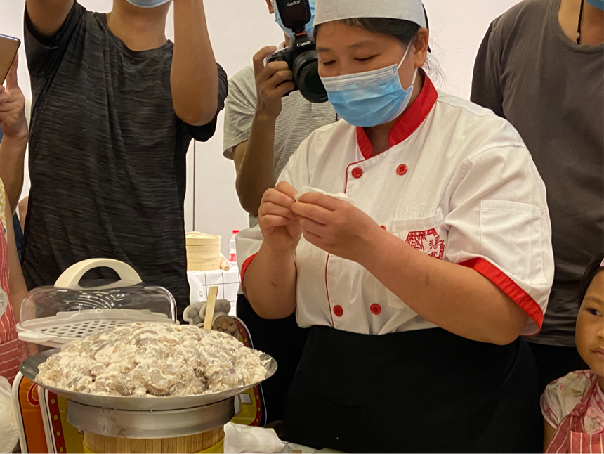 现场,王金镜师傅、何国德师傅和陈瑞歌师傅演示了虾饺的制作,从开粉开皮到包虾饺的整个过程,并亲自教授绿茵白兔饺、梅花饺和鲈鱼饺三种象形点心的制作手法。
