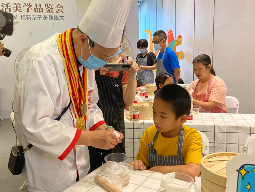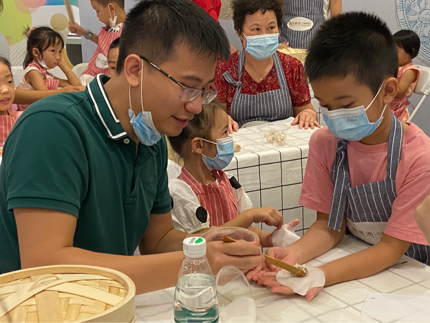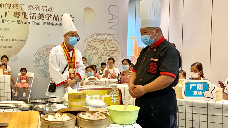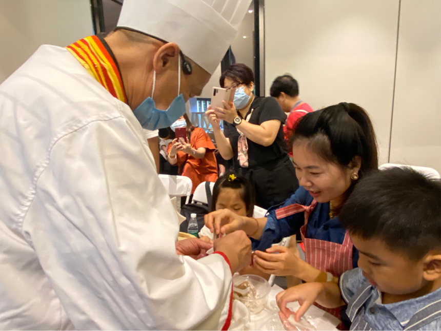 广州市象形点心非物质文化遗产传承人、广东著名点心大师、中国烹饪大师王金镜师傅、泮溪酒家点心部主管何国德师傅,中式面点高级技师陈瑞歌师傅现场与荔湾区抗疫一线工作人员、新花城APP用户、社区居民一同交流粤菜文化,并亲自向30个亲子家庭传授经典虾饺和创新绿茵白兔饺的制作“秘技”,将粤菜师傅匠心和广府美食文化送进社区“最后一公里”。同时,荔湾区文明办也向到场的30个亲子家庭送上活动大礼包。