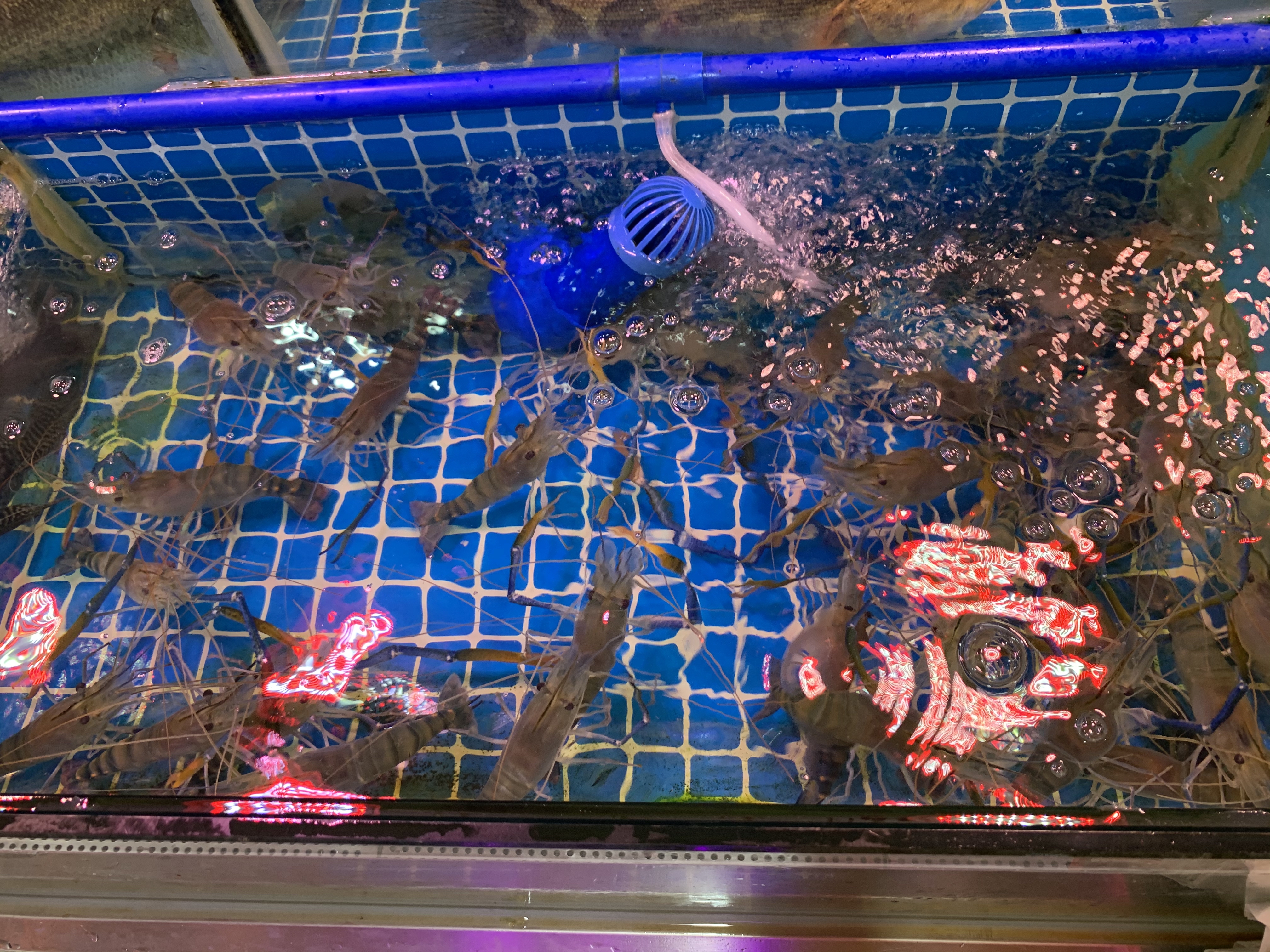 “目前,明虾和九节虾一天的销量在100多斤。价格上,明虾价格降幅最大,每斤比去年便宜10元。我们去养殖产地采购,进货价大约在每斤10-15元。”