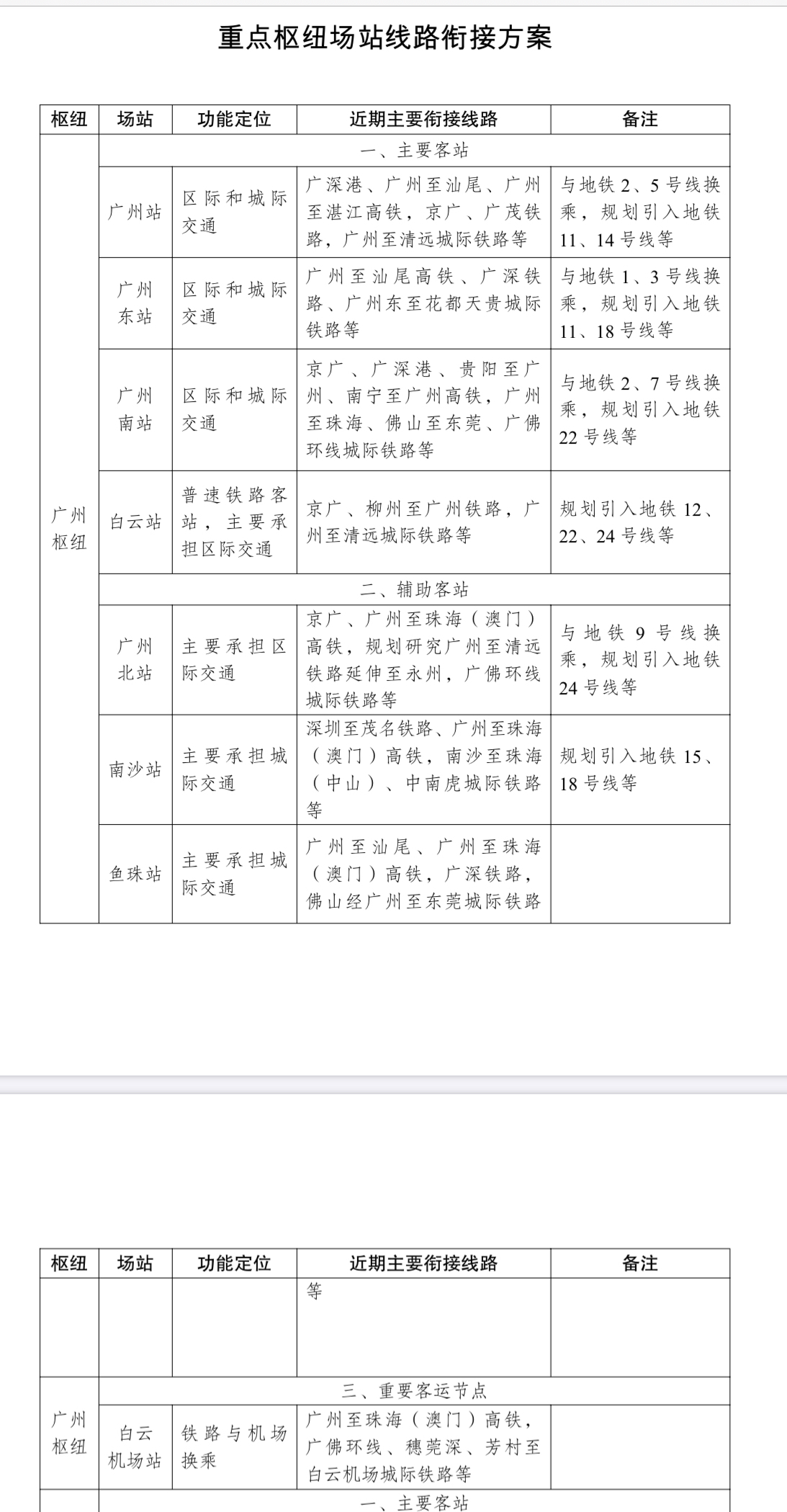 重点枢纽布局和衔接方案方面,粤港澳大湾区城际铁路与高铁、干线铁路通过枢纽换乘实现互联互通,与都市圈市域(郊)铁路、城市轨道交通在枢纽场站换乘衔接。广州枢纽主要场站间通过城际铁路环线和城市轨道交通连通,其余枢纽内各场站间通过城市轨道交通等方式实现连通。