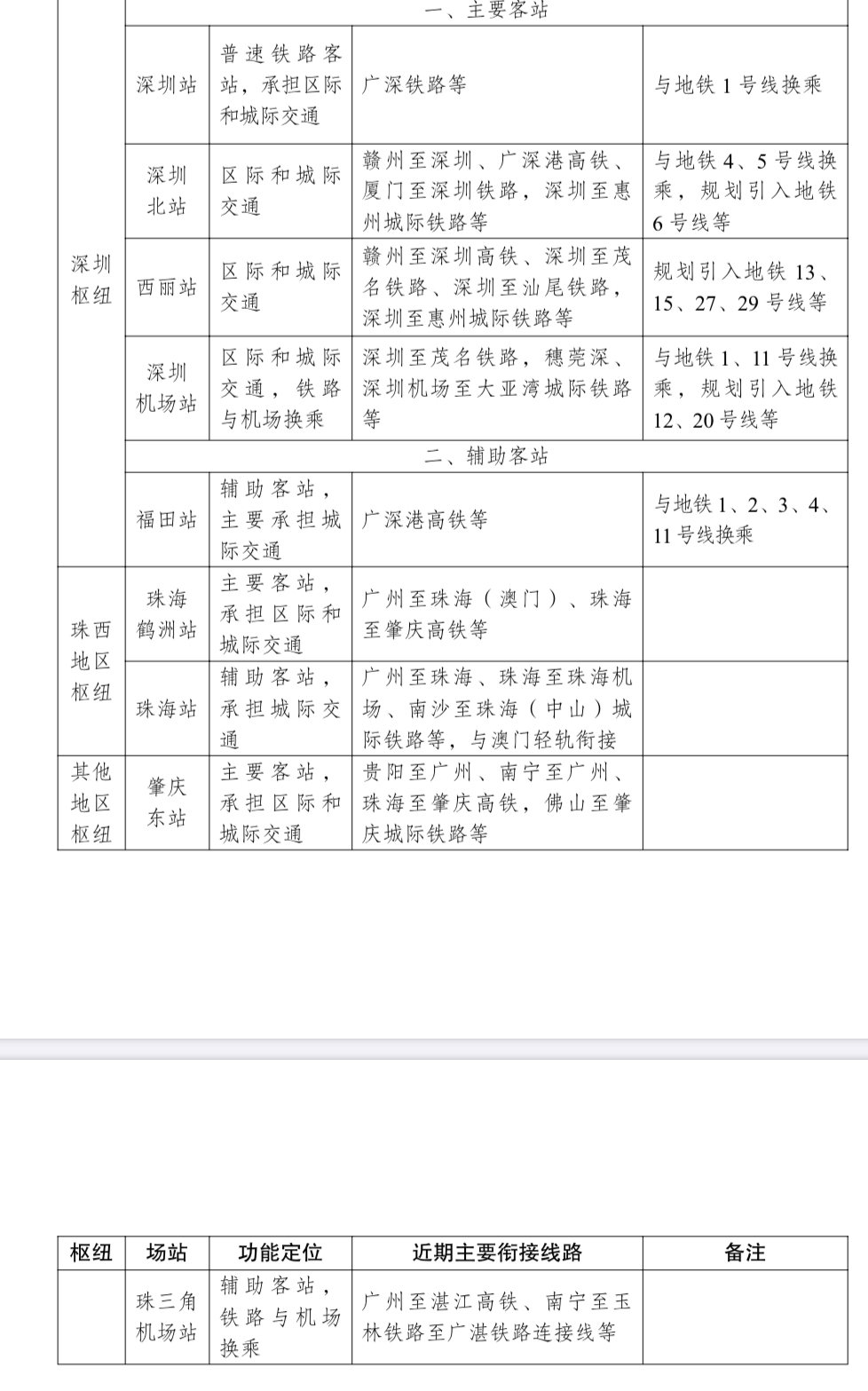 其中,客运枢纽总体布局,构建粤港澳大湾区内层次分明、分工合理、衔接高效的铁路客运枢纽体系,促进对外交通、城际交通和城市交通便捷衔接换乘。广州枢纽布局以广州、广州东、广州南、佛山西、广州白云(棠溪)站为主,广州北、南沙、新塘站为辅的“五主三辅”枢纽。深圳枢纽布局以深圳北、西丽、深圳站为主,深圳东、福田、深圳机场、深圳坪山站为辅的“三主四辅”枢纽。珠西地区布局以江门、珠海鹤洲、中山北站为主,珠海、中山、蓬江、横琴站为辅的“三主四辅”枢纽。此外,规划布局鱼珠、东莞西、惠州、肇庆东、珠三角新机场站等枢纽场站。