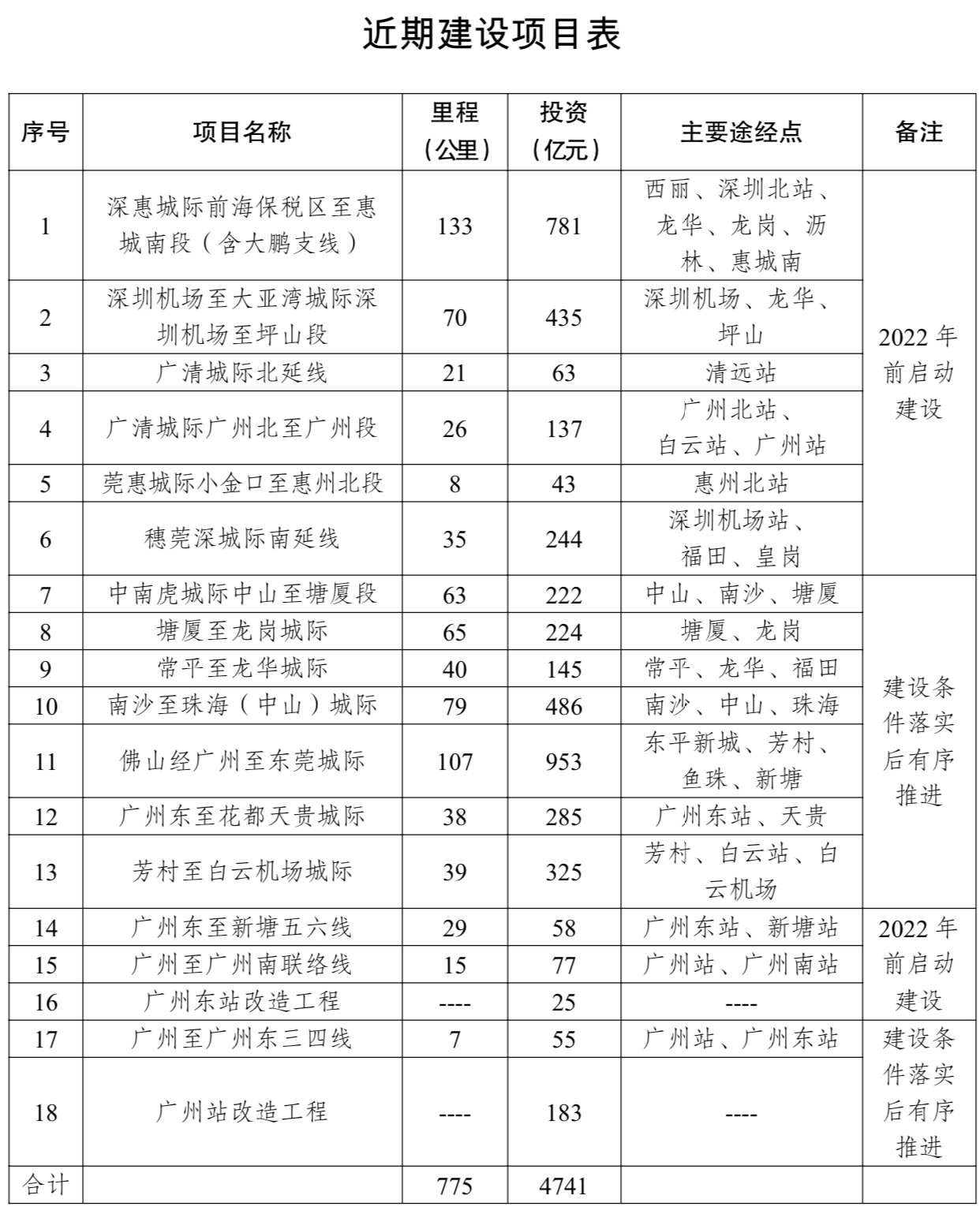 近期建设安排方面,规划建设13个城际铁路和5个枢纽工程项目,总里程约775公里,形成主轴强化、区域覆盖、枢纽衔接的城际铁路网络。其中,2022年前启动深圳机场至大亚湾城际深圳机场至坪山段、广清城际北延线等6个城际铁路项目和广州东站改造工程等3个枢纽工程建设,规划建设里程337公里;待相关建设条件落实后,有序推进塘厦至龙岗、常平至龙华等7个城际铁路项目和广州站改造工程等2个枢纽工程实施,规划建设里程438公里。