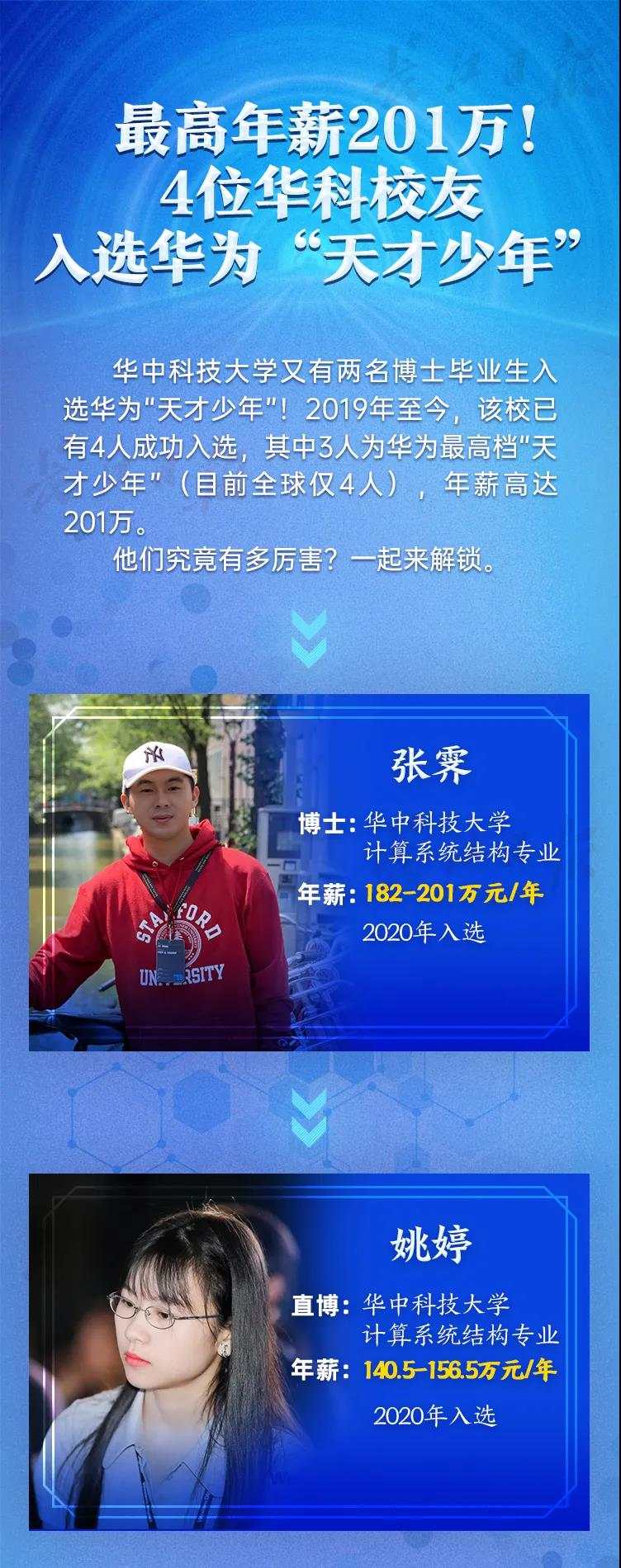 8月3日,长江日报记者从华中科技大学获悉,该校今年计算机专业毕业的博士生张霁和姚婷入选华为“天才少年”。其中,张霁拿到华为“天才少年”最高一档年薪201万元。