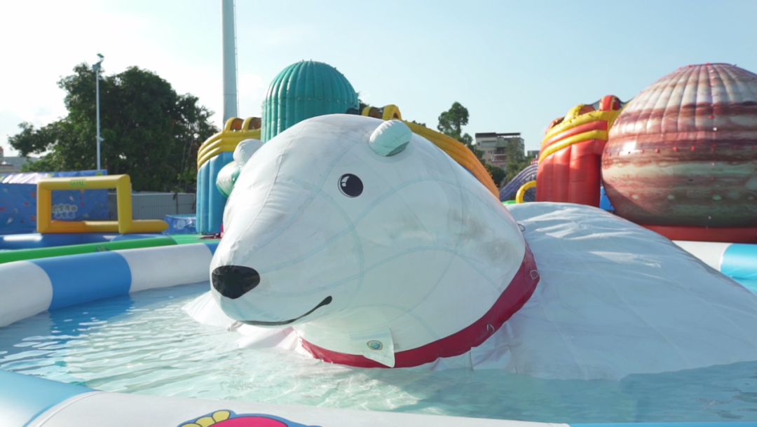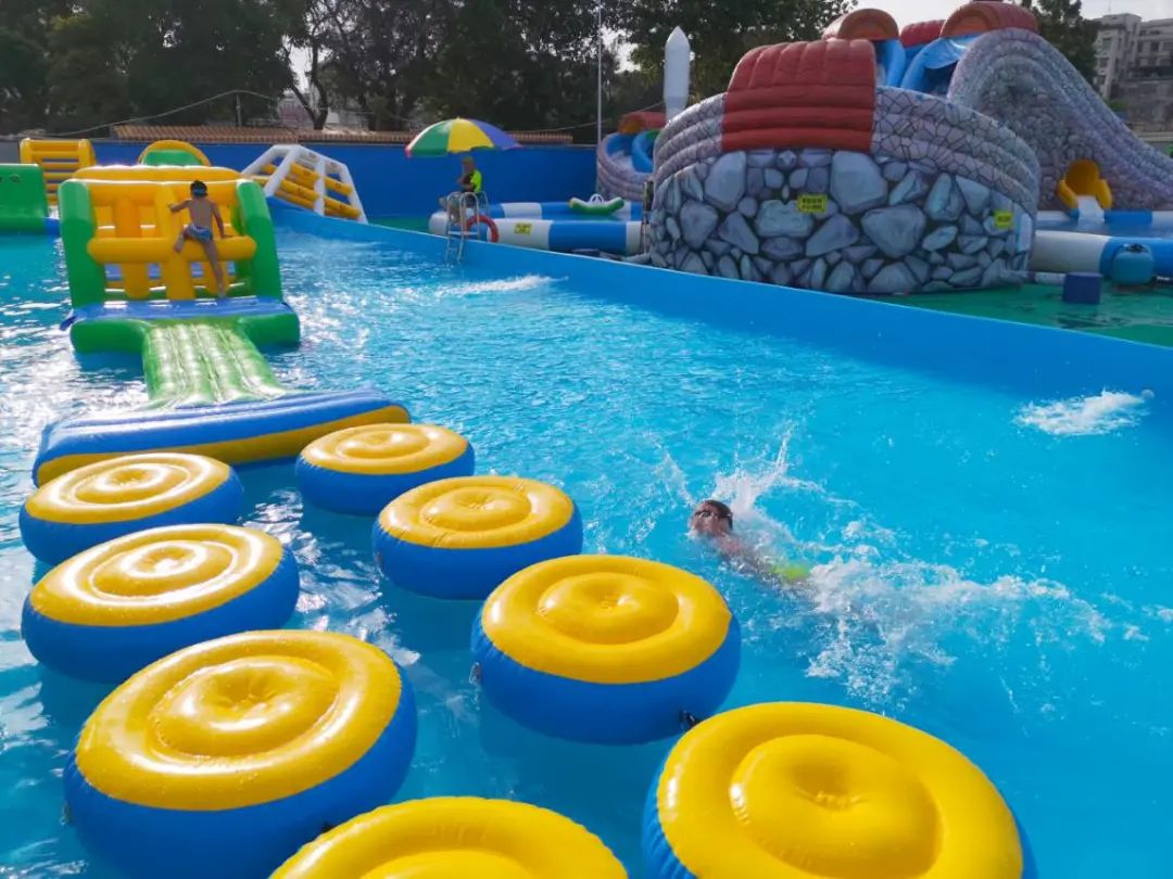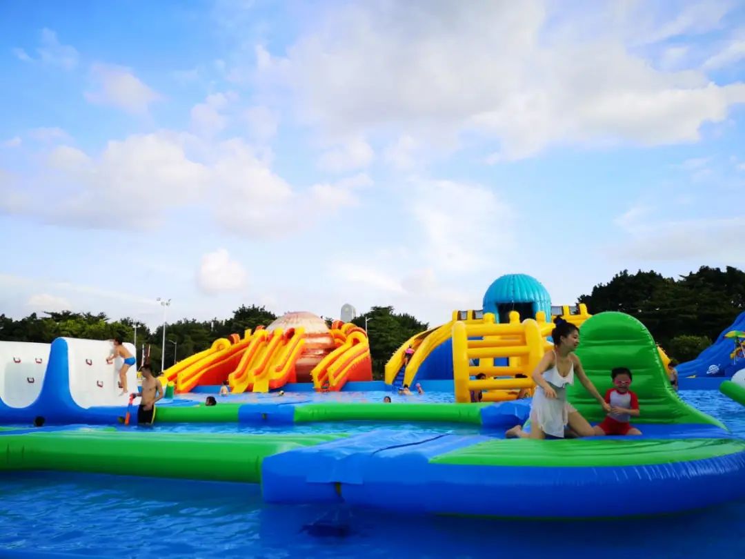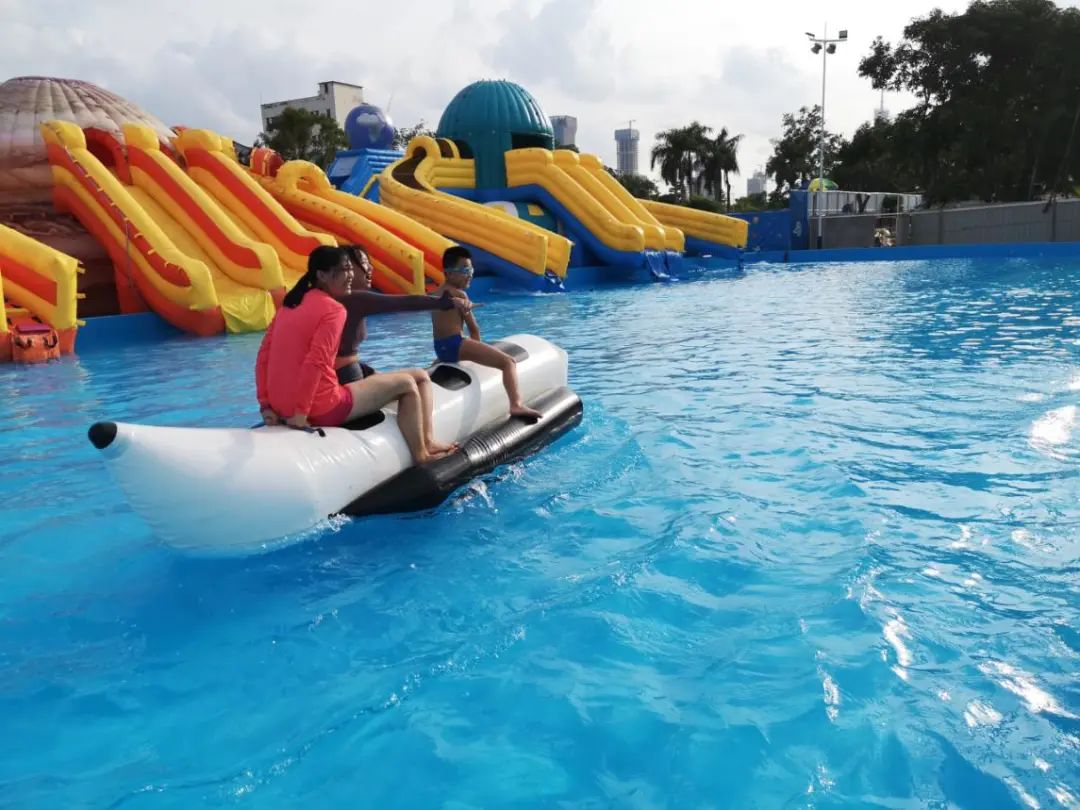 园区中心是占地约1000平方米的水上闯关池。这里配备了香蕉船、滚筒等充气装备,让你什么都不带也能尽兴而归。