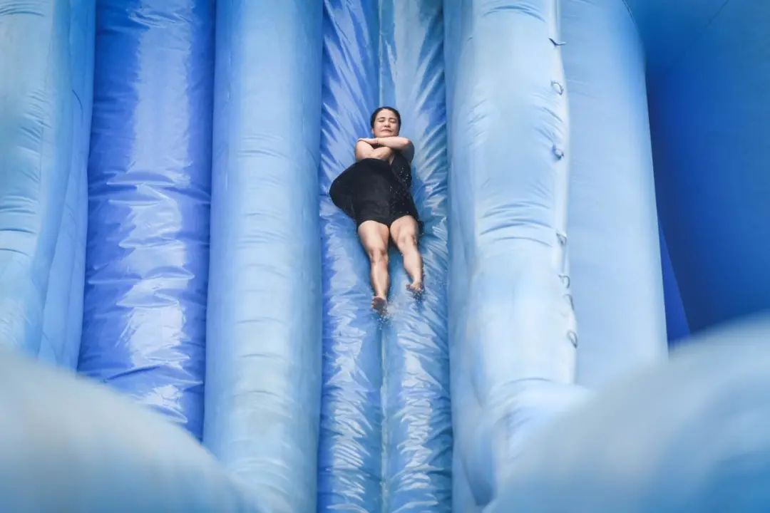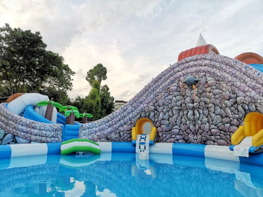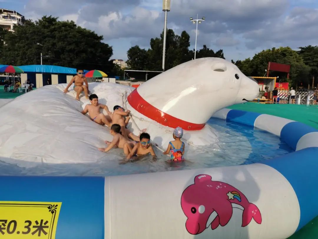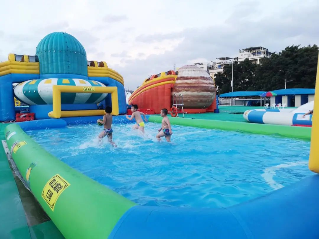 园区中心是占地约1000平方米的水上闯关池。这里配备了香蕉船、滚筒等充气装备,让你什么都不带也能尽兴而归。