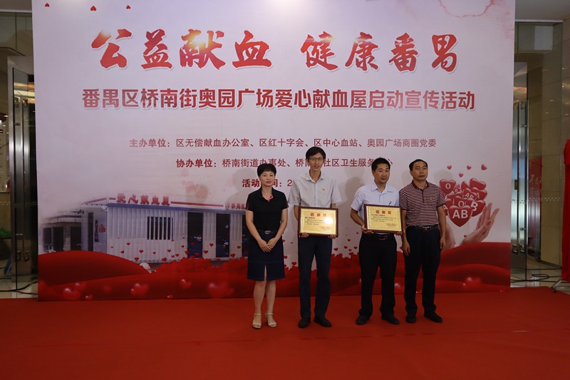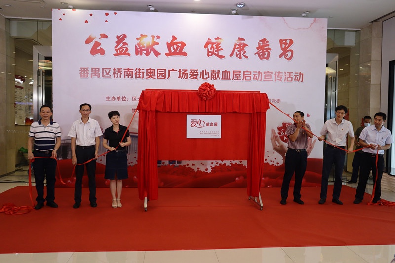 8月1日,番禺又一爱心献血屋启用,该献血屋位于番禺区奥园广场北门的公交总站旁,这是番禺区启用的第三个固定献血屋。在揭牌仪式上,主办方还为热心支持爱心献血屋建设的桥南街奥园广场商圈党委及广州公交集团二汽番禺片区颁发感谢状。