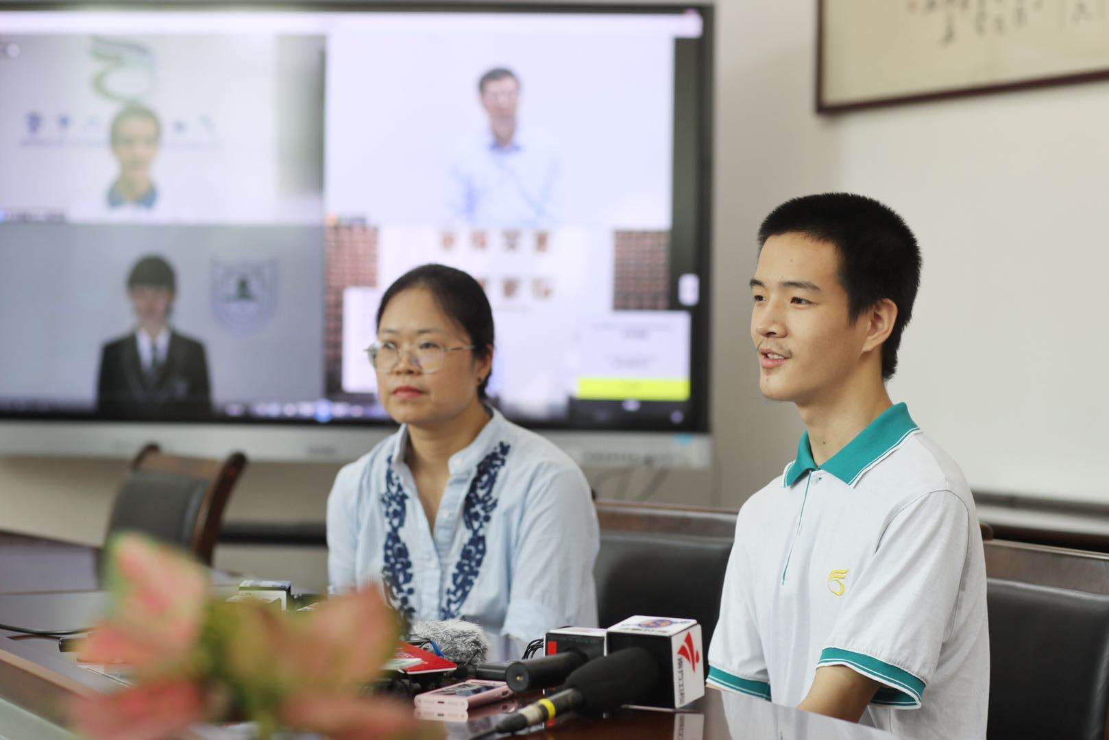 刘洋和广州六中强基计划负责人之一、刘洋英语老师王慧珊一起接受媒体采访。