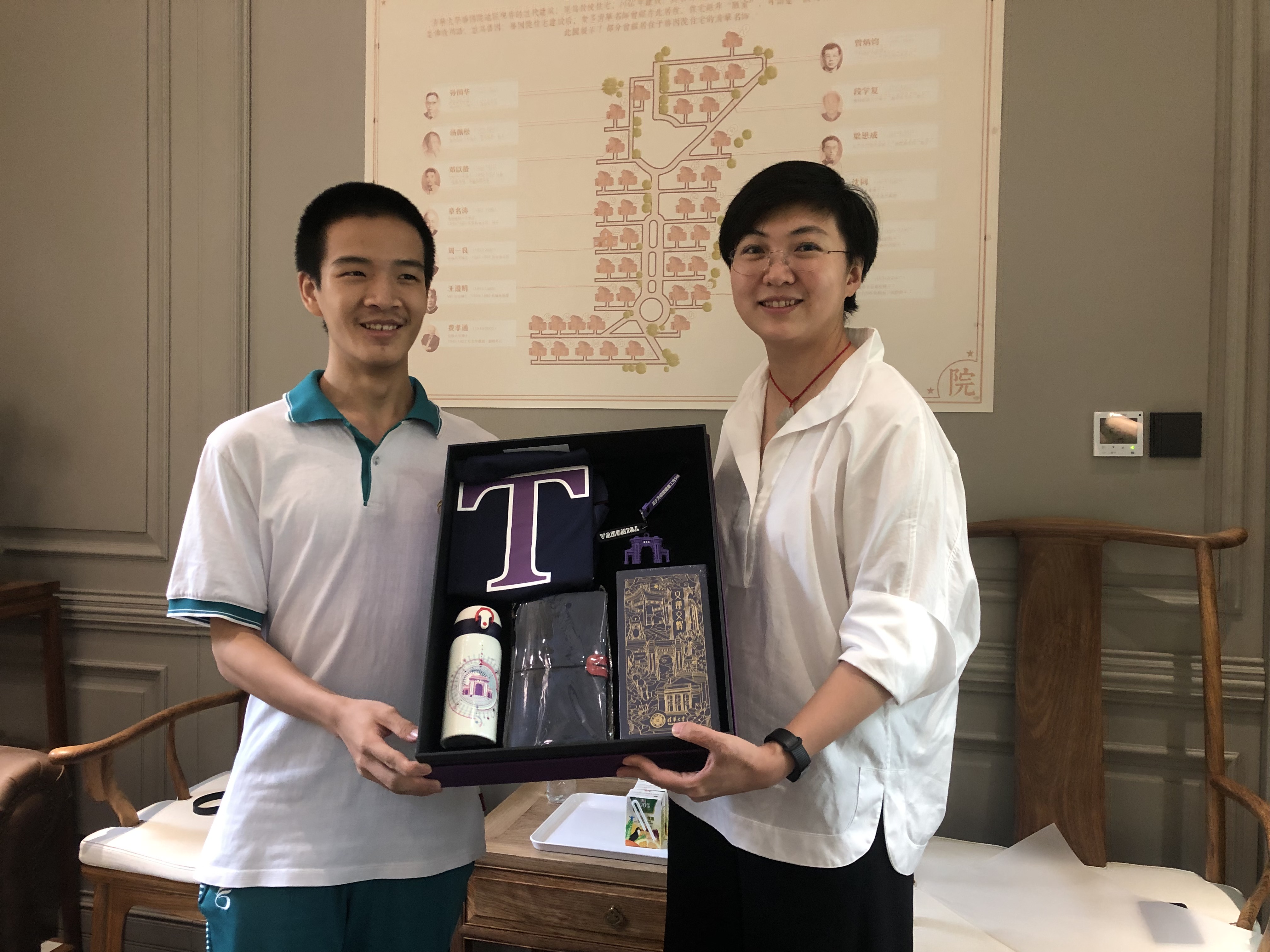 清华大学招生办主任余潇潇向刘洋赠送“欢迎大礼包”。