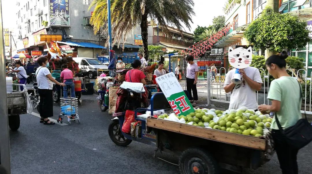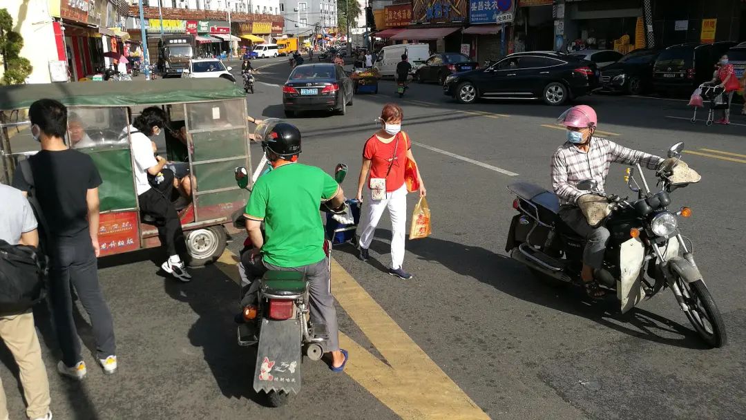8月6日早上7:50至8:30,时值上班高峰期,中成路有家禽、水果等流动档口停路边摆卖。谷裕市场门口及中成路与银兴路交叉口摩的鸣笛兜客,其中不乏无牌摩的,车费5元一人。摩的进入银兴路后继续鸣笛穿行,示意步行者或停在路边的年轻人是否需要搭乘摩的。有路人说:“这里每天都差不多这样,堵车的情况并不多。”