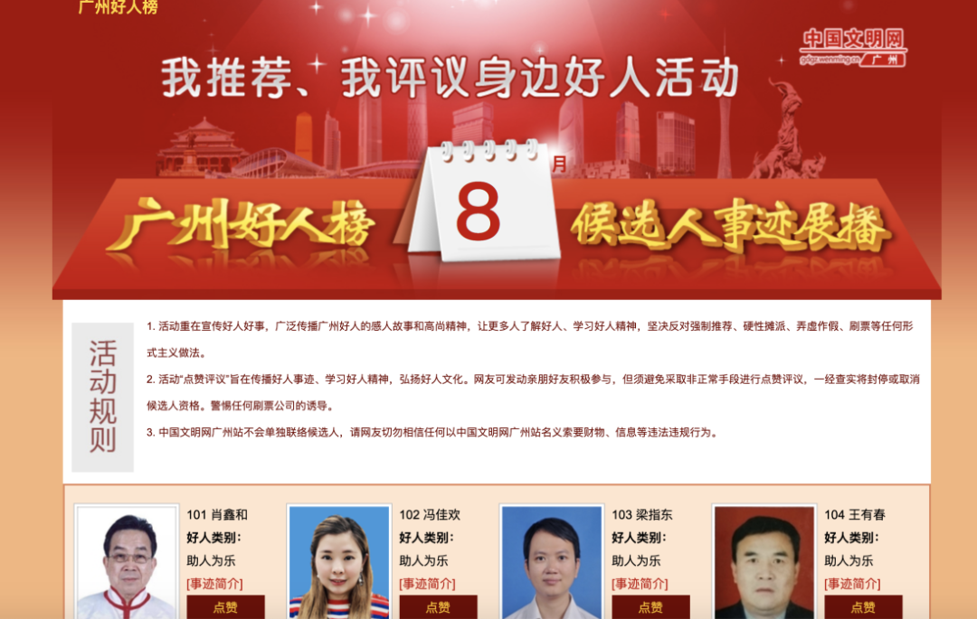 由广州市文明办主办、广州文明网承办的“我推荐我评议身边好人”8月网络点赞评议开始啦!