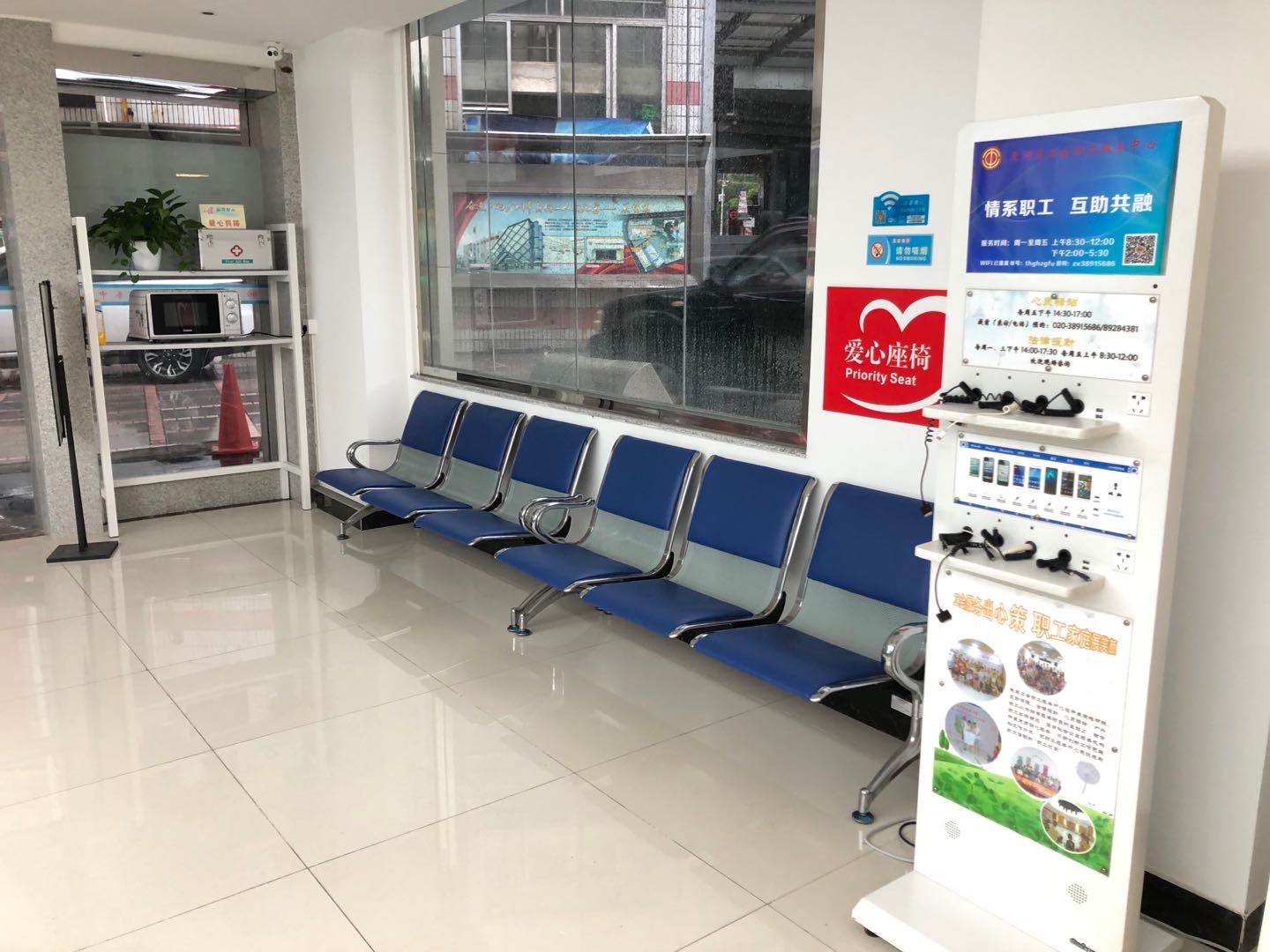 广州市员村工人文化宫内的户外职工小休站在2015年1月挂牌。记者看到,经过升级,现在该小休站内的环境相当不错。小休站面积较大,空间充足,除了配备了微波炉、爱心药箱、爱心桌座凳、饮用水之外,特别值得注意的是,小休站内一座近两米高的充电桩。充电桩上带有十几根不同数据线,基本上覆盖了现在市面上常用型号手机的充电需求。此外,该小休站还提供WiFi服务,WiFi密码直接张贴在墙上,有需要的户外劳动者可以自行使用。