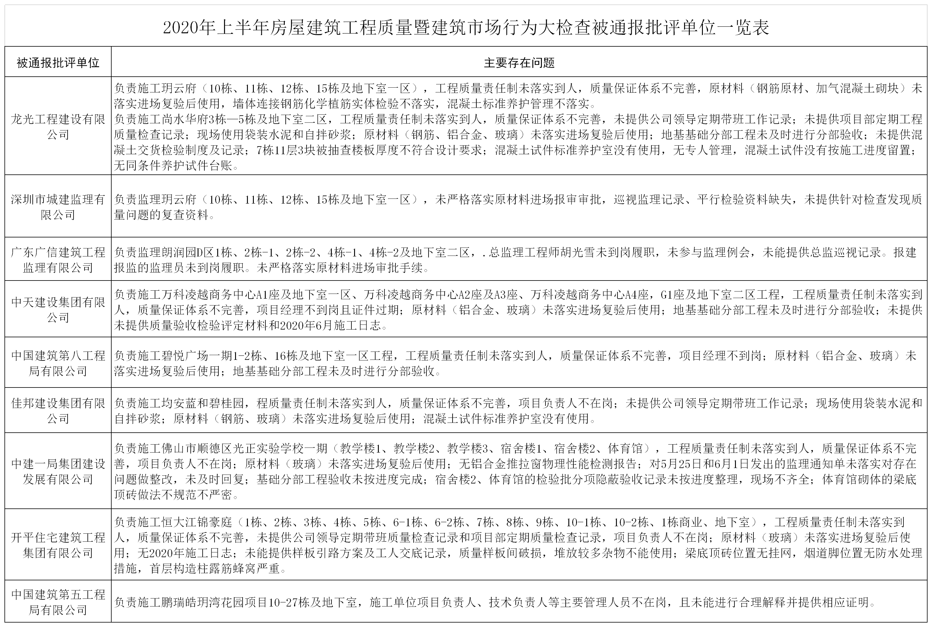 据了解,这九家企业分别是:龙光工程建设有限公司、深圳市城建监理有限公司、广东广信建筑工程监理有限公司、中天建设集团有限公司、中国建筑第八工程局有限公司、佳邦建设集团有限公司、中建一局集团建设发展有限公司、开平住宅建筑工程集团有限公司、中国建筑第五工程局有限公司。