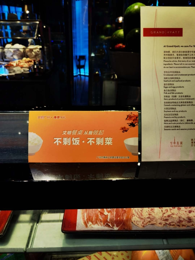 今日,记者走访多家餐饮门店,发现不少餐饮门店都有提倡“节约粮食”的措施。在天河的海航威斯汀酒店知味自助餐厅里,餐厅门口的咨客台上就放着台卡,印着“文明餐桌,从我做起,不剩饭、不剩菜”的提醒语,进入餐厅后,在服务台侧面也粘贴了一样的提醒语,并用红色的背景纸,起到更加强烈的提醒功能;在红棉中餐厅的入门检疫站点,免洗洗手液前也放置着提醒的台卡。