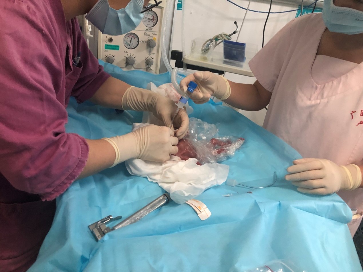 4月17日,两姐弟相隔40分钟娩出,出生时呼吸微弱,全身器官发育极不成熟。按规定新生儿救治要在20秒内完成气管插管,由于两姐弟体重过小,国内最小的喉镜对两姐弟来说也太过大了,这给抢救带来很大挑战。广医三院技术娴熟的黄小霞医生和曾健飞医生3-4秒钟就完成对新生儿的气管插管,并使用T组合复苏器对新生儿进行正压通气。
