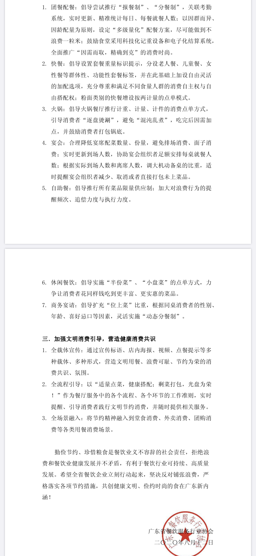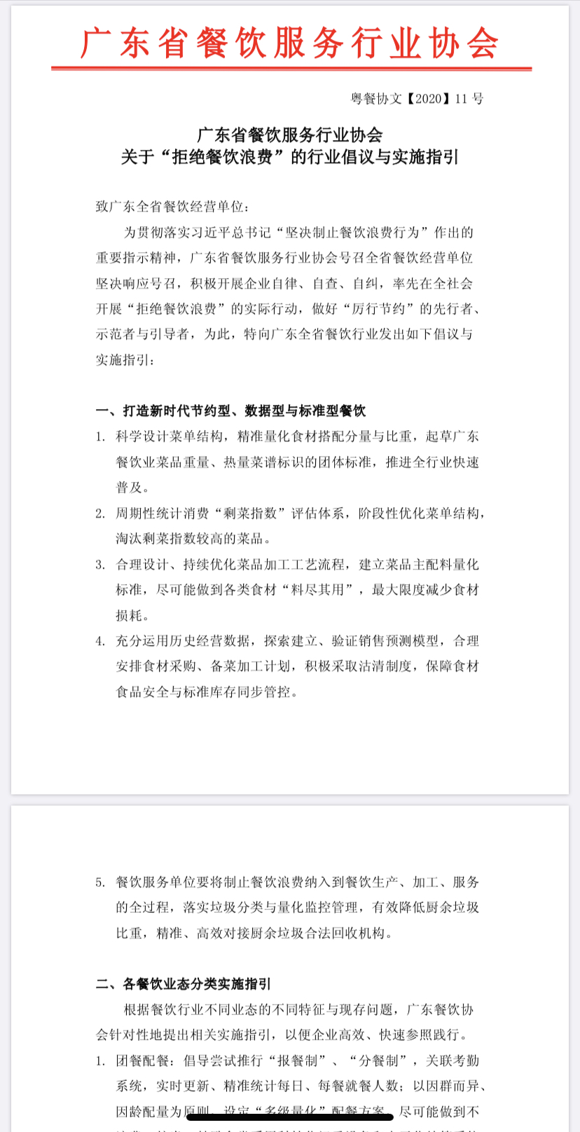 在《广东省餐饮服务行业协会关于“拒绝餐饮浪费”的行业倡议与实施指引》指出: