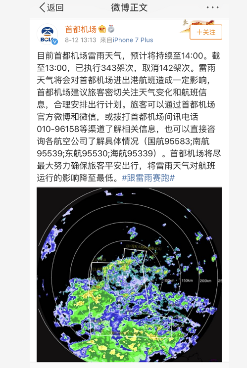 首都机场官方微博截图另据北京市气象局官方微博消息,北京市气象台8月12日13时40分发布大风蓝色预警信号:预计当前至13日5时,北京市将出现8级左右短时大风,请注意防范。