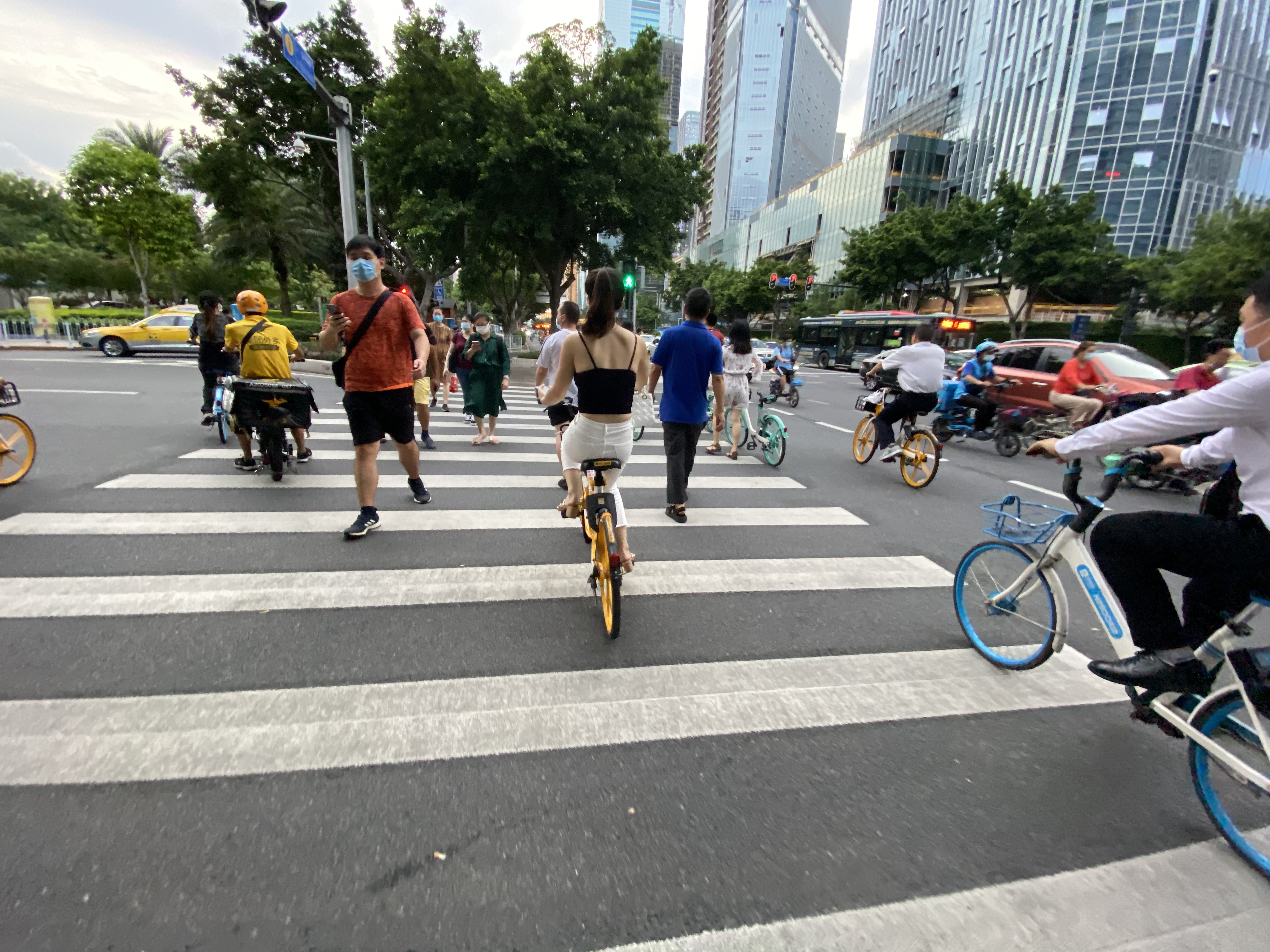 非机动车道引导线在人行横道旁边,用两条平行虚线划分开来,为通过路口的非机动车“开通”了一条“安全通道”。记者看到,现场有志愿者引导非机动车驾驶员从非机动车引导线骑行通过路口,而对于未从非机动车引导线通过的车辆,志愿者们提醒他们下车推行过马路。大部分非机动车通过非机动车道引导线通过,仍有个别市民骑行从人行横道斑马线通过。正准备过马路的陈女士表示,将非机动车道和人行横道分开更安全:“分开后秩序好了很多,不然行人和单车过马路都受到影响,人多的时候单车骑不过去,还有安全隐患。”