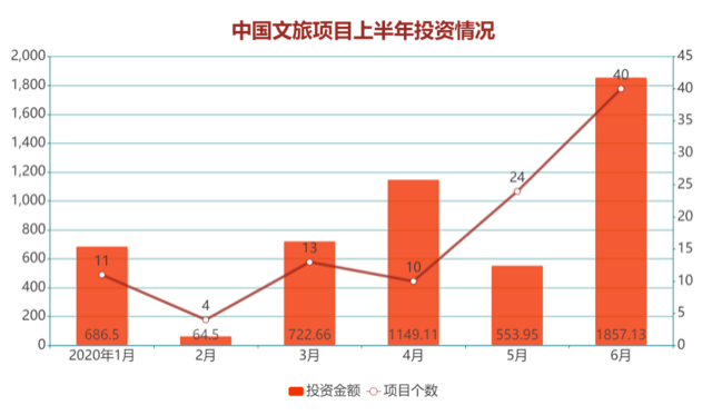 据观点指数不完全统计,2020年1-6月国内文旅项目投资102宗;总投资金额5033.85亿元,同比下降25.2%。可以看到,总投资金额较2019年同期有了相当幅度的下跌。但数据在逐月恢复,而到了6月份更迎来了今年第一个文旅投资高峰。