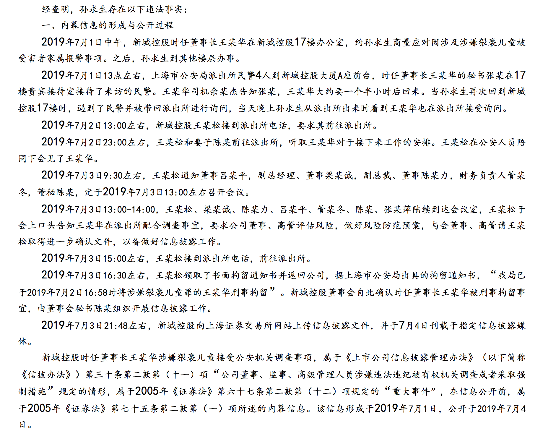 2019年7月1日,孙求生与内幕信息知情人王某华接触,知悉王某华因涉及涉嫌猥亵儿童接受公安机关调查一事,7月2日“孙求生”“钱某娟”证券账户各抛售“新城控股”20,000股,7月3日“孙求生”“钱某娟”证券账户各抛售“新城控股”5,000股,7月4日新城控股关于公司实际控制人兼董事长被刑拘事项的信息披露文件刊载于指定信息披露媒体。