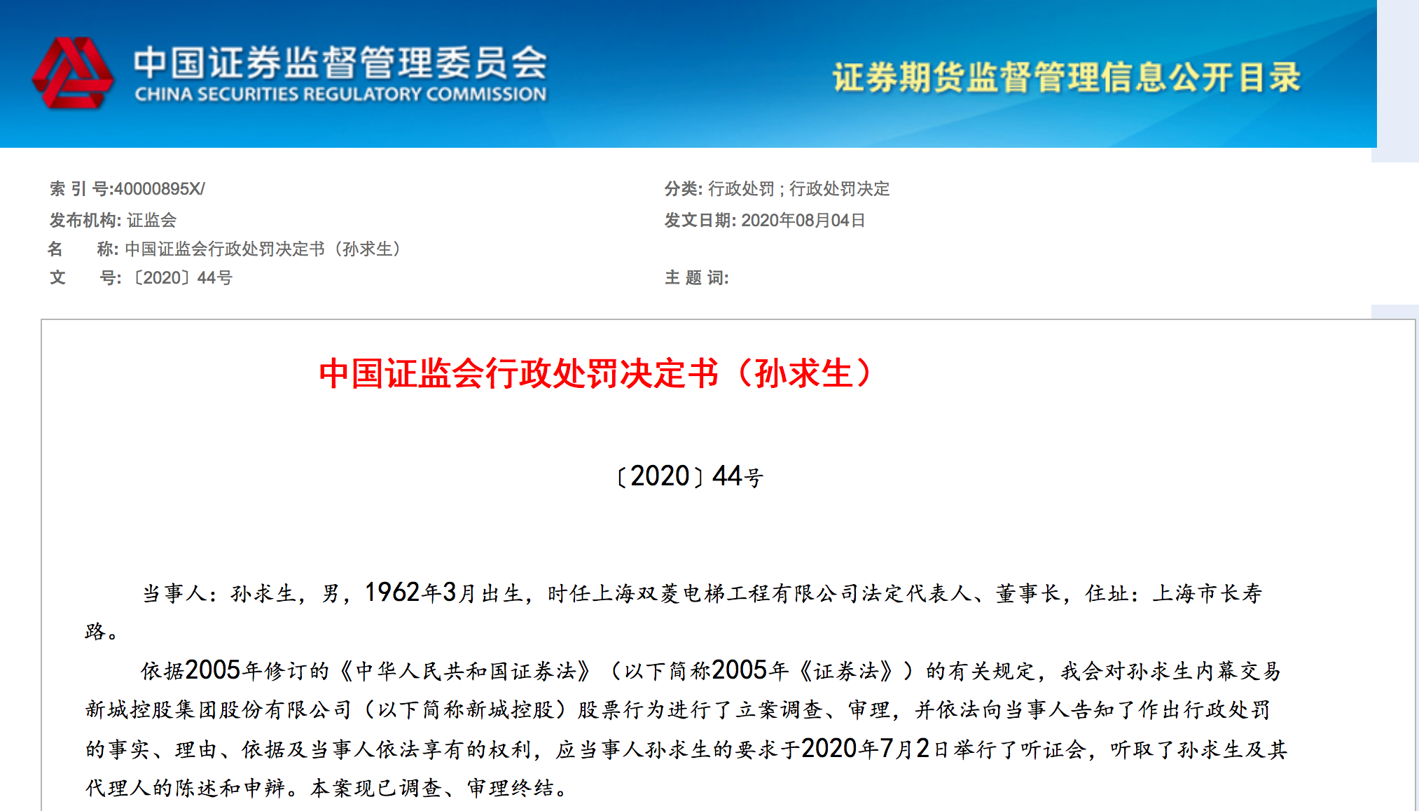 据证监会官方网站8月11日消息,8月4日,证监会下发〔2020〕44号行政处罚决定书(孙求生)。据显示,证监会对时任上海双菱电梯工程有限公司法定代表人、董事长孙求生内幕交易新城控股集团股份有限公司(以下简称新城控股)股票行为进行了立案调查、审理,证监会决定没收孙求生违法所得65.43万元,并处以130.867万元的罚款。