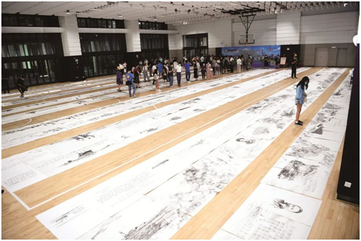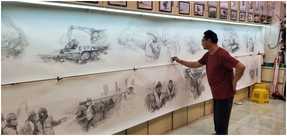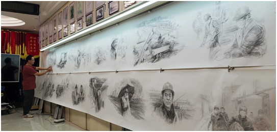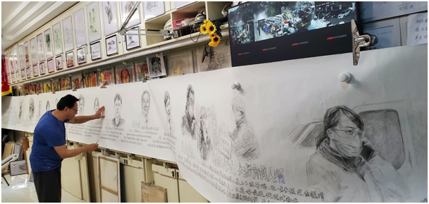 一个个鲜活的人物造就了中国抗疫的“奇迹”,不仅有党和国家领导人在疫情压顶时的坚定与刚毅,也有一位位抗疫先锋舍生忘死的卓绝与果敢,更有火神山医院、雷神山医院日夜兼程10天竣工所缔造的中国“神话”……他常常笔下生风、思如泉涌,一幅长142米、宽0.75米,500多个抗疫英雄人物、5000多个空心字、分上中下三篇的“抗疫主题素描长卷”如行云流水般一气呵成,全面展现出中国在此次抗击新冠肺炎中的历程与重要事件。