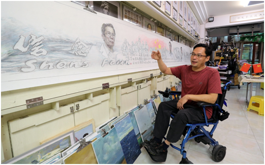 在获得认证次日,记者来到李昱成画室时,他正坐在轮椅上,腰部的理疗仪不时发出嗡嗡的响声。“2月初,我和妻子从海外采风回国,一到家,关于疫情的新闻如潮水般涌来,此后的每一天,我都被感动着,中国人的众志成城在这一刻表现得淋漓尽致,我觉得自己应该做点什么。”