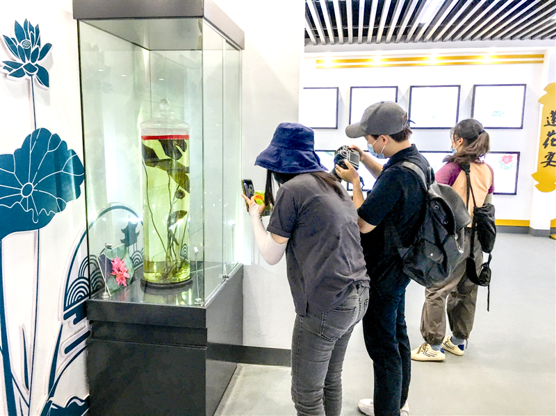 目前,第34届全国荷花展正在莲花山旅游区举行,游客除了可以欣赏来自世界各地的1200余个荷花品种和500余个睡莲品种之外,还可以到莲花文创展馆参观,在清凉的展馆内了解更多莲荷文化。