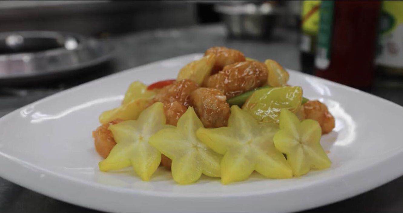 这些菜品用的杨桃都来自钟落潭镇雄伟村,由省级“粤菜师傅”行知学校的烹饪老师研发,从饮品、炖汤到搭配其他鱼肉等菜品,已经形成一个完整的杨桃菜系列。