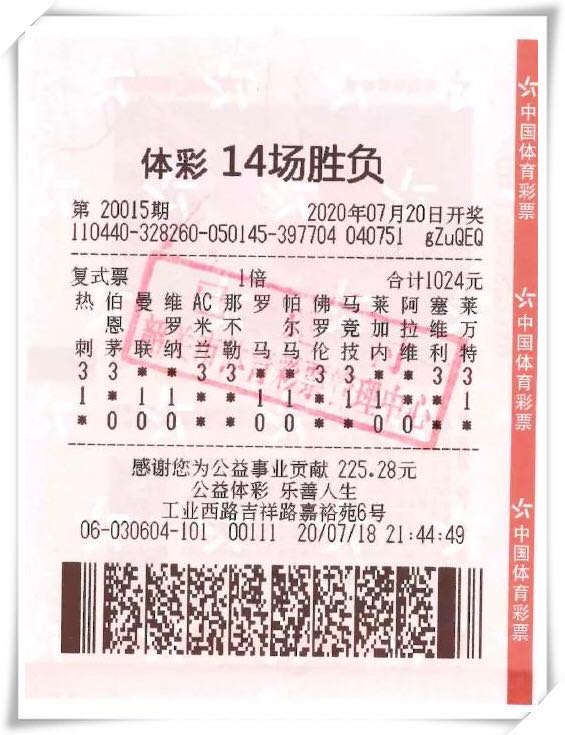 胜负彩第20015期,全国中出一等奖10注,单注奖金超110万元;二等奖229注,单注奖金2万元,韶关市4406030604体彩实体店一购彩者凭借复式投注幸运中得一等奖1注、二等奖9注,揽获奖金合计高达129万元。中奖幸运儿球哥是一名铁杆足彩迷,平日里经常会约上三五知己一起踢球看球买足彩,时常也会中些小奖,乐在其中。