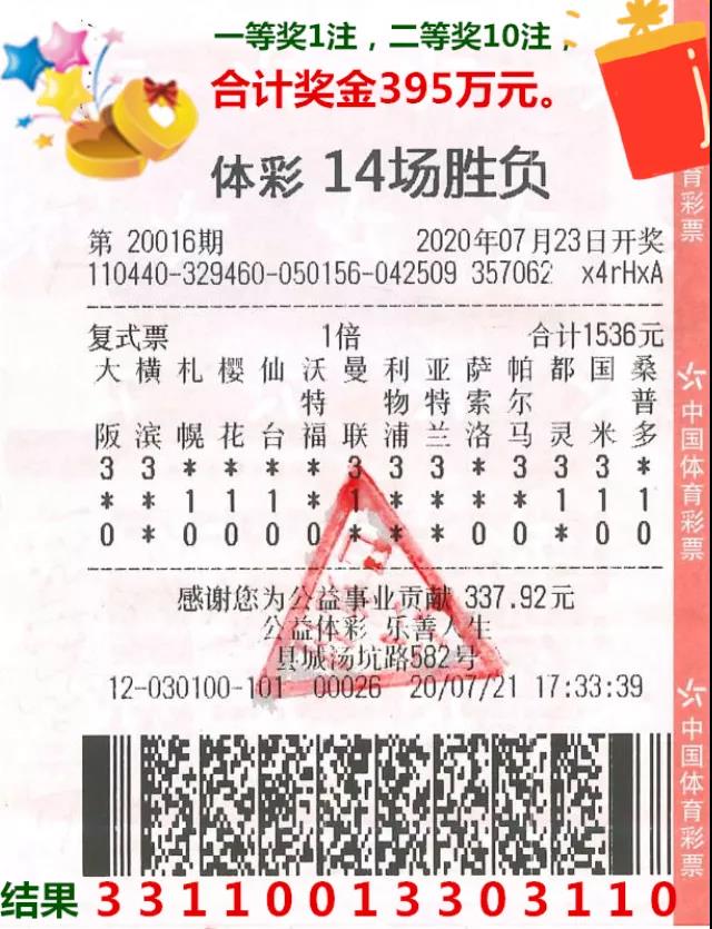 胜负彩第20016期开奖,全国中出一等奖3注,单注奖金超346万元;二等奖91注,单注奖金4.9万元,其中梅州丰顺汤坑路582号4412030100体彩实体店中出1注一等奖和10注二等奖,共获总奖金395万元,创丰顺体彩当地纪录。