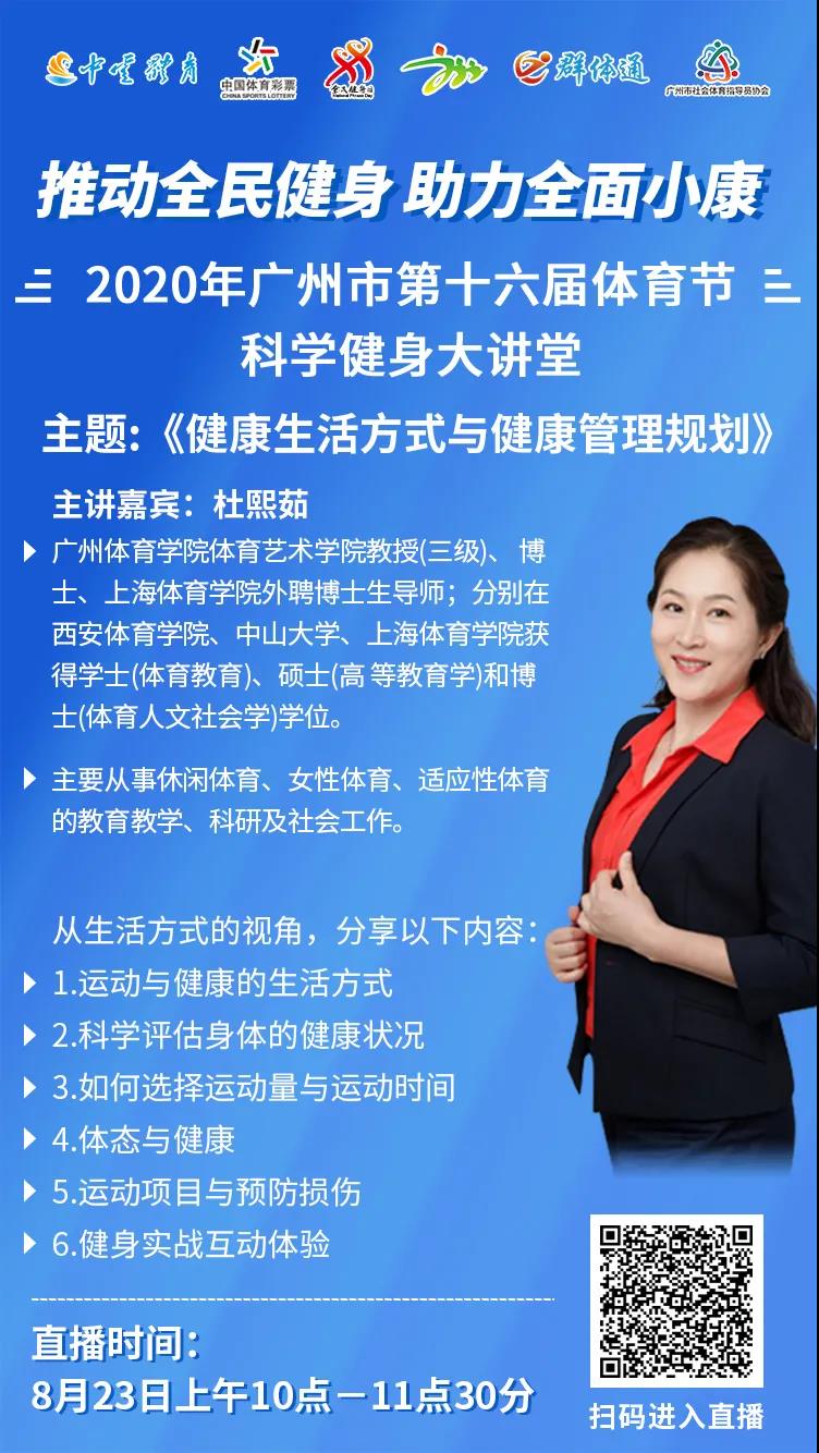 下一期科学健康大讲座将在8月23日周日上午10时开展,特邀请广州体育学院体育艺术学院教授杜熙茹分享《健康生活方式与健康管理规划》,期待您的积极参与。