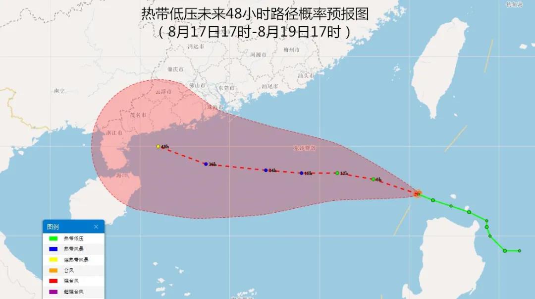 预计,热带低压将以20公里左右的时速向西偏北方向移动,24小时内将加强为今年第7号台风,逐渐趋向我省中西部海面,中心风力将加强到强热带风暴或台风级(10级~12级),并将于19日夜间正面袭击我省。