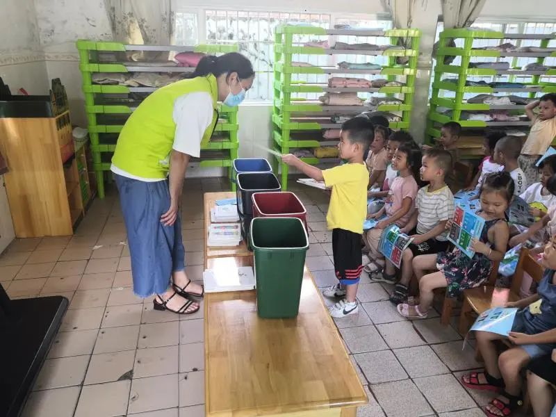 最后,开展垃圾分类小游戏,让小朋友把卡片上的垃圾图片投放到对应的垃圾桶里,加深正确分类投放垃圾的印象,并对分类正确的小朋友派发小礼品。
