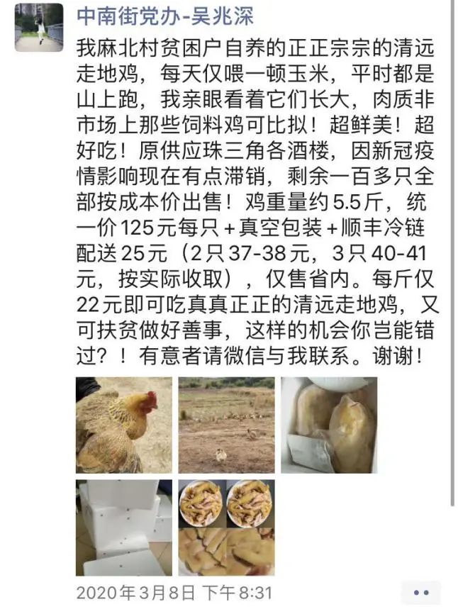 2020年年初的时候,正是疫情防控最紧张的时期,麻北村养殖户家里的清远鸡因为餐馆关门没有了销路,愁眉不展,吴兆深在走访的时候了解到村民们的难处,主动提出在自己的朋友圈帮忙推销,“以前养殖户们都是直接把鸡送去餐馆,疫情的时候餐馆都不开门,我就到把信息发在朋友圈里,看看能不能帮到忙!”