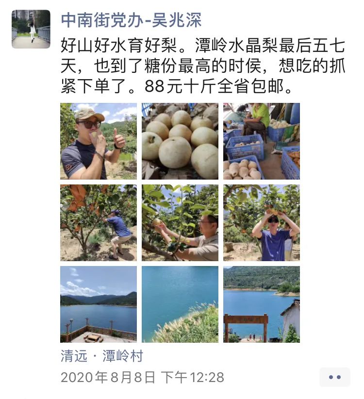 “从来没有想过有一天我也会做起‘代购’,不过为了我们的贫困户兄弟,做什么都是值得的!”最近扶贫干部吴兆深有件忧心的事,朋友开玩笑说他“人设变了”,“过去你的朋友圈都是风景山水摄影作品,很文艺,现在怎么做起代购了,不是走地鸡就是水晶梨,你换工作了?”2019年年中,吴兆深转变身份成为一名扶贫干部,进驻连州市麻北村,开展扶贫工作。