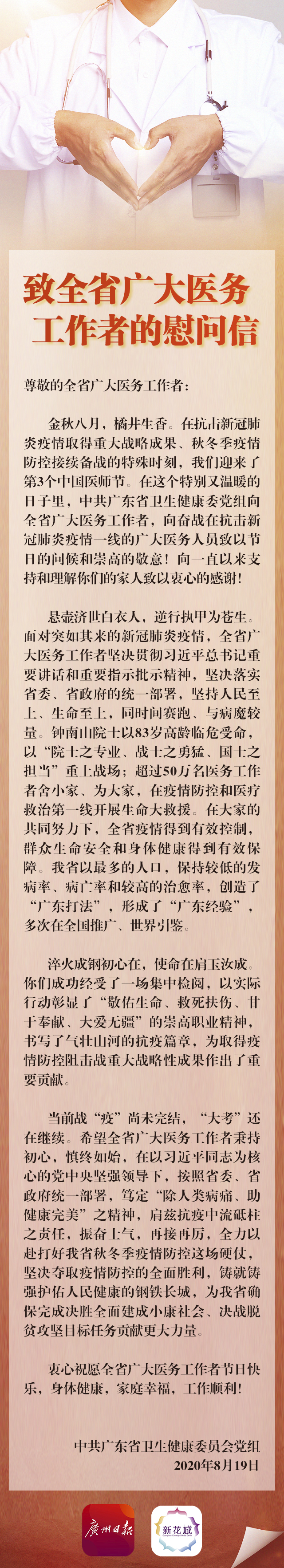 省卫生健康委主任段宇飞宣读了《致全省广大医务工作者的慰问信》:广东以最多的人口,保持较低的发病率、病亡率和较高的治愈率,创造了抗击新冠肺炎的“广东打法”,形成了“广东经验”,多次在全国推广、世界引鉴。战“疫”未完结,“大考”在继续,医务人员还将全力以赴打好我省秋冬季疫情防控这场硬仗。