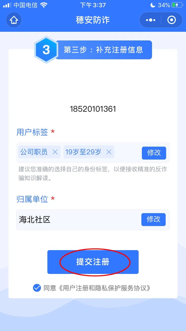步骤二:点击“注册”按钮,根据个人实际情况填写个人信息及所在社区,然后提交即可。