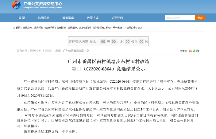 记者8月21日获悉,广州公共资源交易中心对番禺区南村镇塘步东村旧村改造项目公开引入合作企业竞选结果进行公示。公示资料显示,塘步东村近日组织招商主体成员代表会议,按相关规定和程序进行表决,确定广州番禺海怡房地产开发有限公司为塘步东村旧改项目的合作企业。公示时间从2020年8月19日至2020年8月25日。