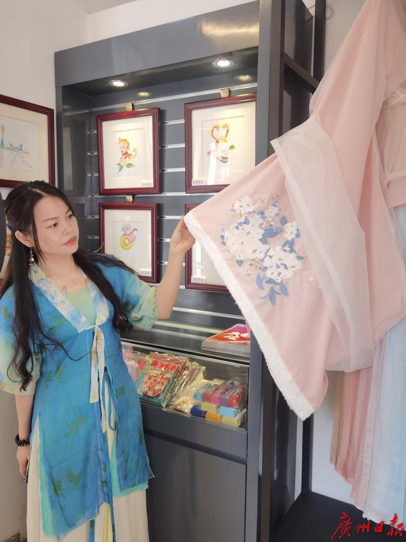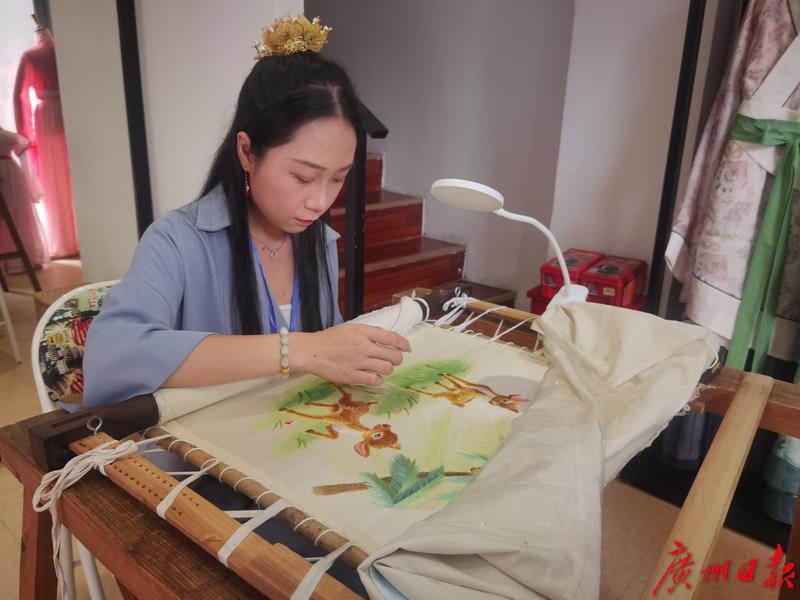 在广绣体验馆,非遗传承人陈少芳的孙女谭靖榆向记者亲自演示了广绣技艺。