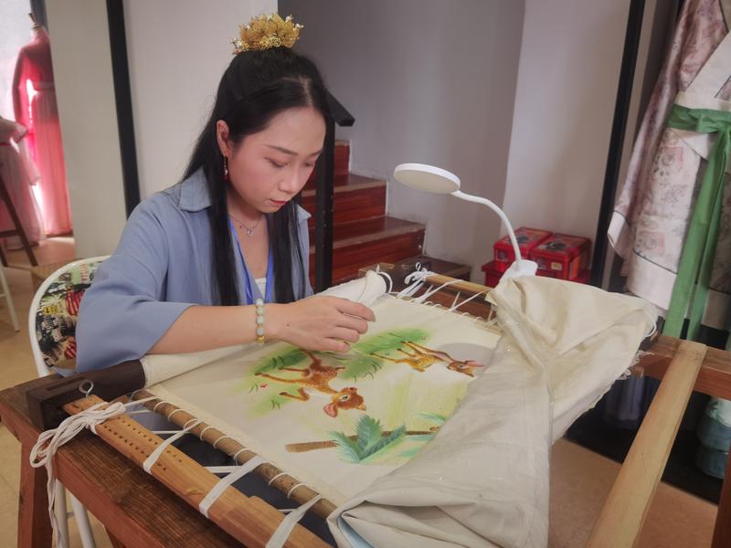 记者逛了一圈下来,发现广州非遗街区的体验宜静宜动。在广绣体验馆,非遗传承人陈少芳的孙女谭靖榆向记者亲自演示了广绣技艺。谭靖榆表示,永庆坊这两年已经成为广州当地特色的网红打卡点 ,通过在街区开设广绣体验馆游客的方式,可以将广绣介绍给更多游客:“游客进入我们的广绣体验馆后,我们的工作人员会向他们简单讲解广绣历史和特色,如果有兴趣,游客还可以现场坐下来免费体验,学着穿针引线、体验广绣。”谭靖榆表示,希望以广州首个非遗街区永庆坊上的广绣体验馆为窗口,增加游客对广绣和本土非遗文化的兴趣。
