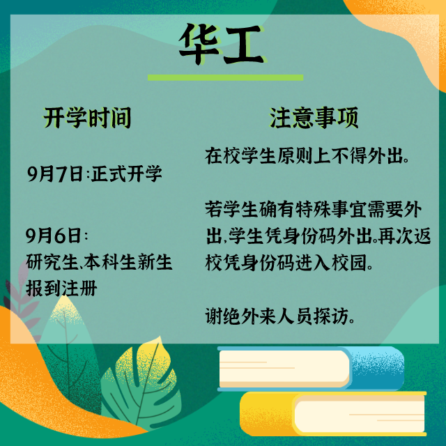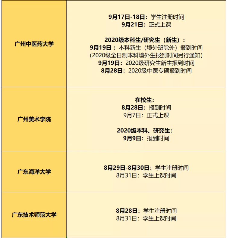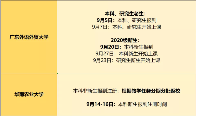 目前,华南理工大学明确在校本科生和全日制研究生9月4日注册,9月7日上课。9月6日2020级本科生及研究生报道。