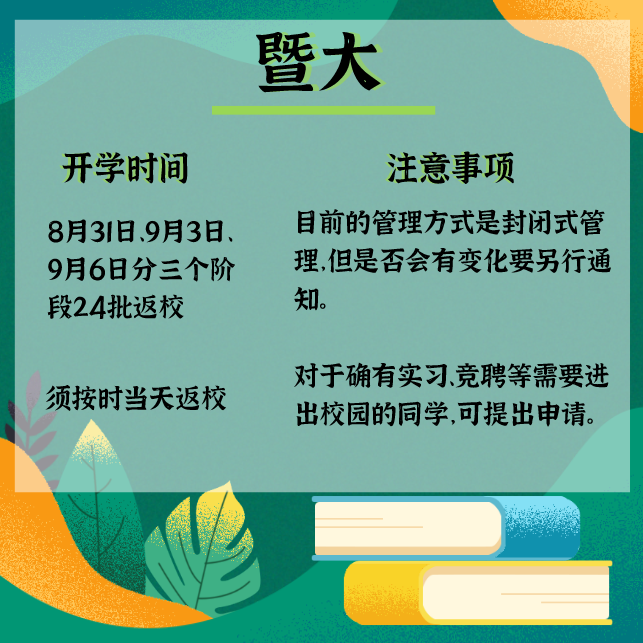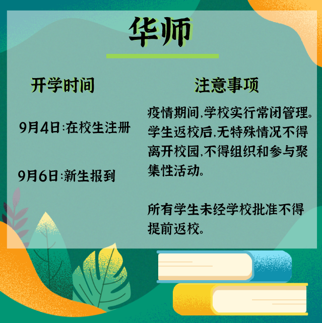 8月15日,华南师范大学官微发布《2020年秋季学期学生返校的通知》,明确秋季学期的返校时间为8月20日起至9月初,分6个批次组织学生分期、错峰、安全返校。身在境外、14天内有国内高风险地区旅居史以及被评估确定为重点人群的学生暂缓返校。