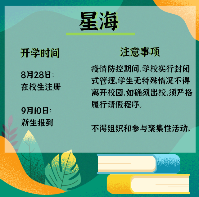 8月17日,星海音乐学院“星海后勤”发布《关于做好2020年秋季学期开学疫情防控工作的通知》,明确从8月27日起,全校教职员工返校上班,8月28日老生回校注册,新生 9 月 10 日报到。